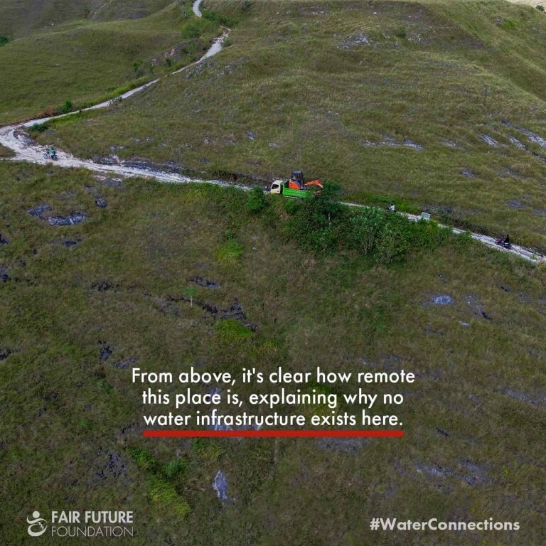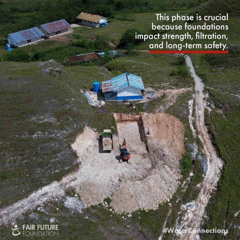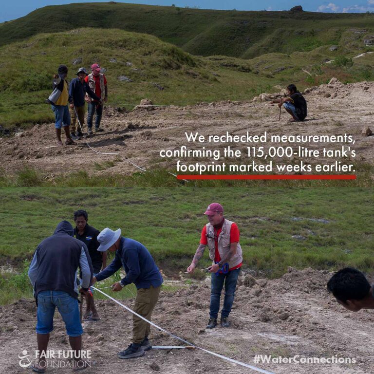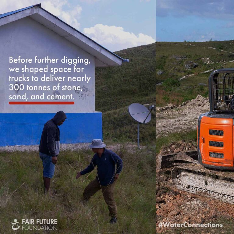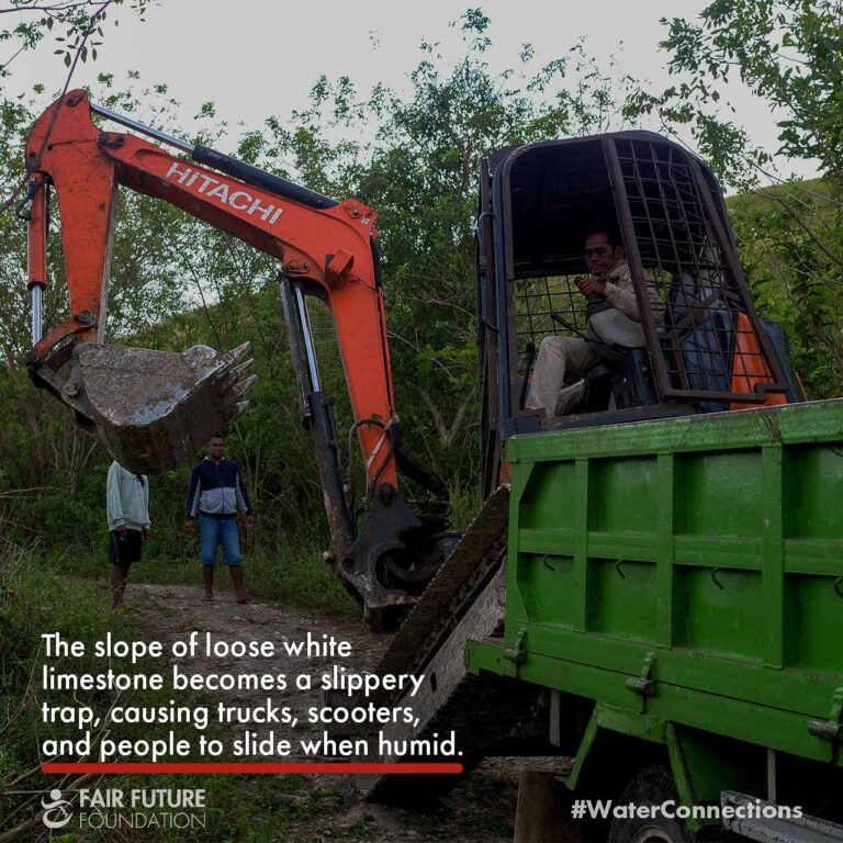 Starting this 115,000-litre reservoir in Laindatang meant carving a path into a hill that has never known clean water. To bring the small excavator up there, our teams from Fair Future and Kawan Baik spent days repairing the broken limestone road, pushing stones by hand, guiding the machine metre by metre. On this slope, everything slips: trucks, scooters, people. But without this work, the reservoir’s foundation would simply be impossible.
