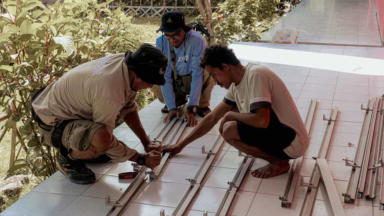 Recognising this urgent situation, the Fair Future Foundation, in collaboration with Kawan Baik Indonesia and Smart Energy Tech Bali, took on the task of bringing light to this community. With the help of the villagers of Haray, we carried all the necessary equipment by hand over rugged terrain: sixteen solar panels, a 5,000-watt hybrid inverter, and 14,000 watts of robust lithium batteries. For five demanding days, powered by a small generator, we worked tirelessly in the dark to install this innovative technology.